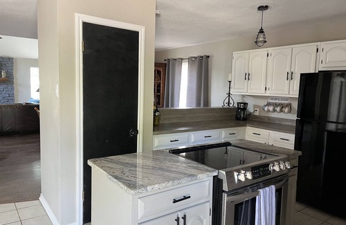 The Lodge has central HVAC, large limestone wood fireplace, 50" Smart TV, wireless internet, dishwasher, electric range, microwave, standard coffee maker (coffee provided), K-Cup coffee maker. Washer and dryer with detergent. Full bathrooms have plenty of towels, hair dryer, flat iron and curling iron.
