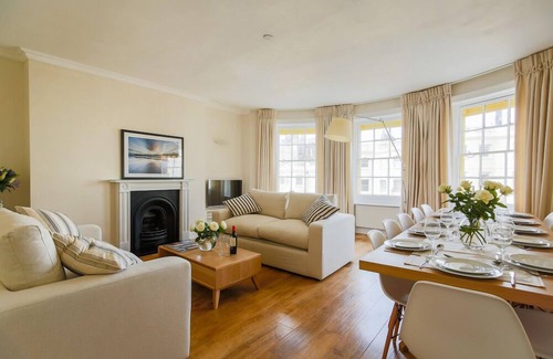 It has three bedrooms, a very large living room with dining area that can seat up to 12. It is the ideal location for family gatherings and hen nights. A large fully equipped kitchen and two large bathrooms. It takes up two floors of a large and very elegant Regency building. For groups over 12 there is the option at additional cost of booking another stunning apartment on the floor below which will allow you to accommodate groups up to 16 in total.