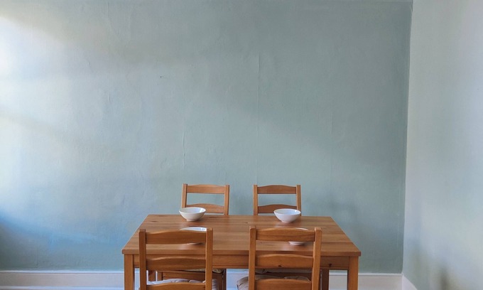 Living room is bathed in natural light from three large sash windows. Gets sun in the afternoon. Furnished with dining table, four chairs and a small sofa.