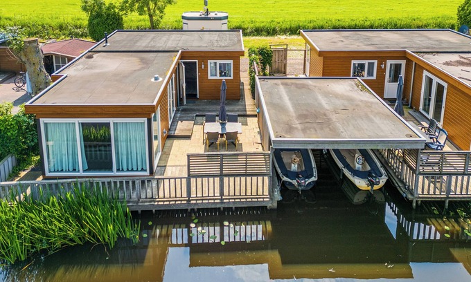 Lovely spacious Chalet, including a sloop on a quietly located park between nature and meadows. Everything exudes peace, and the atmosphere is charming. The Chalet has three bedrooms, Chaleta bathrooms, and a living area with an open kitchen. Very modernized. The place is unique and has a spacious terrace with a jetty and a covered boathouse where the sloop that belongs to the house lies. You sail straight from the house onto the Frisian lakes. Note: the fuel for the sloop is not included