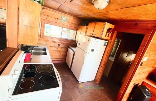 Walk into the open living/dining room area, with lovely hardwood floors and large windows with a view of the lake. Plenty of room for eating, curling up by the wood-burning fireplace, or watching a good movie. To the right, there are two bedrooms on the main floor. The first bedroom has a queen bed and a twin bed, and the second has a queen bed. To the left of the living room, there is a large full kitchen with a dishwasher. The kitchen includes a breakfast area. A full bathroom with a shower/tub combo is to the left of the kitchen at the top of the steps leading to the basement.