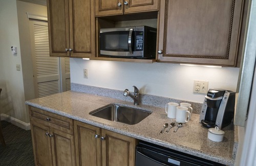 The townhouse features separate bedroom and living room areas, two bathrooms, wet bar, refrigerator, stereo, two LCD color televisions, DVD Player, Keurig coffee maker, microwave, and toaster. It's a full service resort with typical amenities and services. On site restaurant.