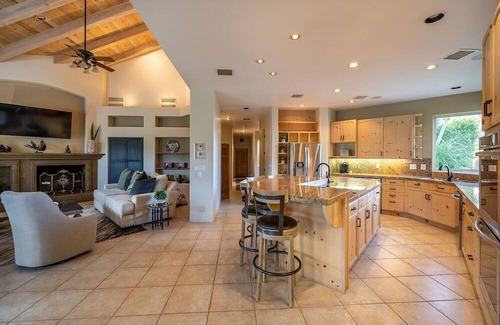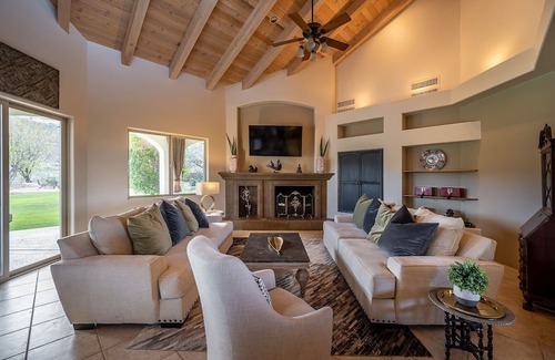 Escape to this luxury villa located in the private Cahuilla Hills neighborhood in Palm Desert, CA. Enjoy the extraordinary sunrise views of the Coachella Valley from your bedroom or upstairs patio and the majestic sunsets that fall behind the mountains while your enjoying the backyard when dining, swimming, play horseshoes, putting on the green or sitting around the fire. The entire villa is privately yours. As you arrive to this luxurious grand circular drive way with a beautiful desert landscape. BACKYARD: Is the perfect desert escape with a private pool and spa, fruit trees, horseshoe pit, putting green, secluded lounge and fire pit, outdoor dining, lounge by the fire on the patio as you watch your favorite TV show or Host an amazing event or wedding on the massive lawn space that is surrounded by trees and desert landscape. As the sun goes down the bistro string lights give the most amazing ambiance as it lights up the entire backyard. The bird life is EPIC and the native flora is fascinating. There is another house being built next to us. It does not detract from your privacy and need for quiet. Also, there is a PELETON here, should you be a fan. INSIDE: The upstairs has 1 bedroom and 1 bathroom with a private patio that looks over the Coachella Valley. Down stairs you can enjoy one of the 3 seating areas. In the morning room drinking your coffee, in the grand room or the main open seating area that looks out to the beautiful backyard. A king dining table that seats 12 and a gorgeous kitchen that you can enjoy the views of the valley. 2 large bedrooms with king beds, 1 bedroom with 2 queen beds and a private office with a queen murphy bed. Full access to the property. You have 24/7 care throughout your entire stay Cahuilla Hills – Located three miles southwest of Palm Desert off Highway 74, near Bighorn Golf Club. At 932 feet above sea level, it consists of 632 homes that literally come in all shapes, and sizes. Only minutes away from El Paseo, shopping, dining and entertainment. The house has a large circular driveway and an extended driveway that goes up to the garage.