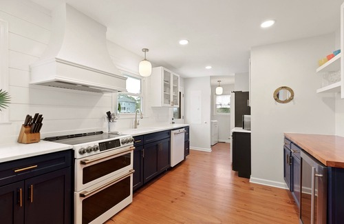 Also on the first floor is the large master bedroom with a king-sized bed and updated ensuite full bathroom. You'll find another renovated half-bath downstairs with little nautical nods to the shore. Head upstairs to locate two bedrooms and another full bathroom. The first guest room has a queen bed and is decorated with a muted coastal design and is sure to be a favorite. The bunkroom is perfect for the kids, who of course will love to "bunk up" in the twin size bunkbeds and one double bed. One lucky kid can be selected to sleep in the prized custom bed nook that is trimmed to resemble a boat's berth. The bathroom upstairs is very large and boasts two wall-mounted sinks, basket weave flooring and luxury fixtures. All beds are made up with high-quality linens and bath towels provided.