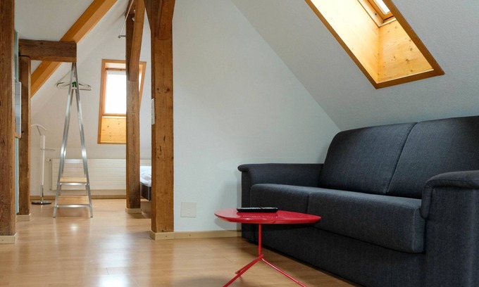 33 m2. More information by the provider: Cosily furnished attic studio with kitchenette, shower/WC, double bed as well as sophisticated pull-out sofa with 2 additional beds. Outdoor area with pergola for shared use. The deep blue Lake Thun beckons about 1 km away. Please note: The house does not have a lift and the studio is reached via 41 steps.