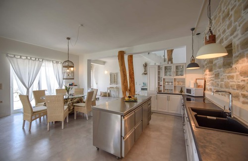 Storage room, freezer, washing machine, large kitchen with gastro - fridge made of stainless steel, coffee machine, espresso machine from Illy, microwave, Pitsos oven and ceramic hob, you will find all conceivable amenities in the house Ella. From the comfortable living area with comfortable sitting area, satellite TV air conditioning, fireplace, heating, you can look at the large heated pool and jacuzzi. The teak patio offers various cozy areas and lounge corners, here you will find the barbecue and fireplace. Sun loungers invite you to relax at the 35 μ² heated saltwater swimming pool with counterflow and adjoining 16μ² Jacuzzi and listen to the waterfall which can be switched on when needed. After a long refreshing bath, you can use the outdoor shower. Pool towels in refreshing green are at your disposal. From each window you have an unobstructed view of the wonderful IDA mountain panorama and the natural spectacle of sun rise as well as cloud games.