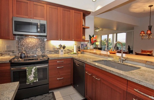 The central living areas is light with a quite atmosphere and decorated with local art with beautiful rugs and linens. Our two smart flat TVs can be connected to your streaming services with upgraded WiFi and cable. The kitchen and bathrooms reflect the natural beauty of Hawaii with sapele cabinets, upgraded appliances and fixtures, that is fully equipped and well stocked, perfect for entertaining or intimate dinners.