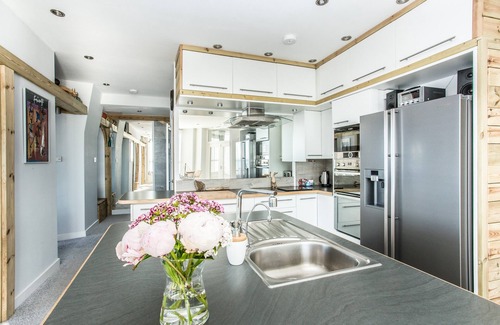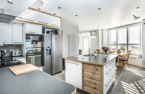 The kitchen is fully equipped with induction hob, integrated electrical double oven, microwave, dishwasher, large fridge freezer with ice and chilled water facility, toaster, kettle, instant boiling water tap and a breakfast bar. The dining area seats 6 people comfortably and has views out to sea.