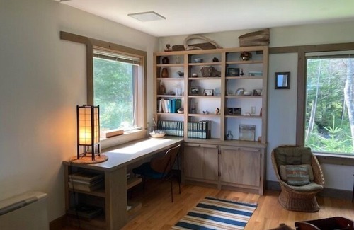 The attached apartment wing (with a separate outdoor entrance but also accessible to the interior of the main house) houses a sleeping area with twin beds and a sitting area with a full-sized sleeper sofa, separated by a stone chimney with wood stove. It also features a built-in desk area, bath with shower, washer and dryer, kitchenette with sink, full-sized refrigerator, microwave oven, and toaster oven. This private retreat is perfect for guests, a couple wishing extra privacy, or those with restricted mobility.