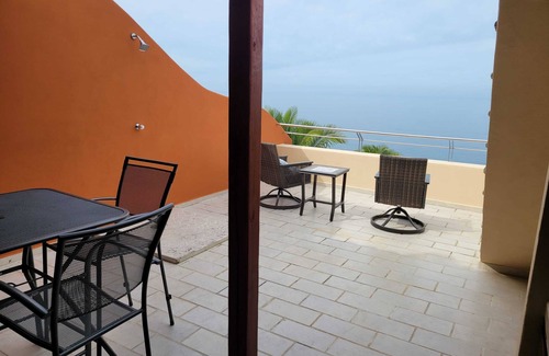 Short and long term stays are welcome at this beautiful ocean view condo at Vista Encantada! Relax on your extra large terrace overlooking the stunning Pacific Ocean in a 1 Bedroom, 1 bathroom condo on the 5th floor. The terrace is equipped with an outdoor kitchenette and furniture and access to the private rooftop cold tub for star gazing and 360 degree views of the ocean and jungle. The bedroom sleeps two people comfortably in a king bed. Condo has WIFI, TV, AC, access to the laundry facilities, elevator, huge pool and more! All of our condos are adults only, though children permitted between the months of May to September.