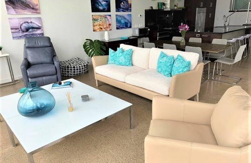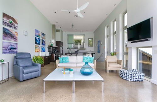 This modern loft style townhome comfortably accommodates 6 people and includes two oceanfront lanais and close to 2,000 square feet of interior space, with 12’ wall to wall sliding glass doors that tempt you outside to feel the Hawaiian Pacific Breezes. All bedrooms are located on separate floors for privacy with lavish spa en suite bathrooms.