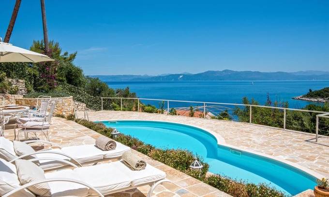 This spectacular villa enjoys one of the most breath taking views on the entire island, stretching from the clear blue Ionian seas towards the mainland, overlooking the fab Mongonissi Bay and its sandy beach, all the way to the channel that leads to the unique gem that is Antipaxos.