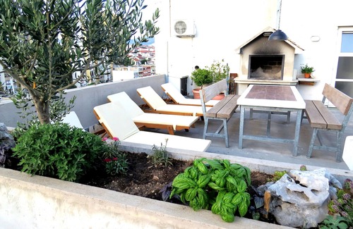 Three bedroom modern furnished apartment with bathroom and auxiliary toilet, balcony with view of Split bay and terrace with shower, barbecue and deckchairs