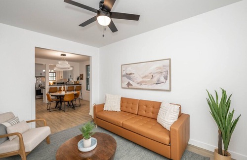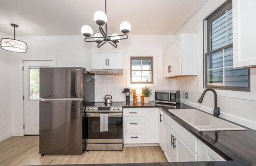 Discover the Charm: Our June 2024 full restoration of this distinguished historic downtown two-story home showcases two generously sized bedrooms, one half bathroom, and a full second-floor bath with a fully tiled bathroom and a luxurious rain shower head. The home, adorned with wood accents, LED touch mirrors, brushed nickel finishes, and bespoke porcelain flooring, encapsulates the essence of sophisticated urban living.