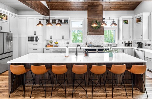 The Island property has 13,000 square feet in total between all structures and is a fully remodeled/new construction facility with a Classy-Rustic Design. There are 4 buildings on The Island: The Main Lakehouse, the Clubhouse, the Cottage and the Bunkhouse/Pavilion. In total, it features 21 bedrooms, 13 bathrooms, 3 full kitchens, 10 living rooms, and more. There are 18 king beds, 4 queens, and about 40 twins throughout the 21 bedrooms and 3 lofts. Every bedroom has either a king or a queen bed. Six bedrooms have adjoining bathrooms, including 4 private master suites. Additionally, 15 of the 21 bedrooms have at least 1 twin bed (some have as many as 6), either in a bunkbed or in a lofted area that is accessible via a ladder from within the bedroom.