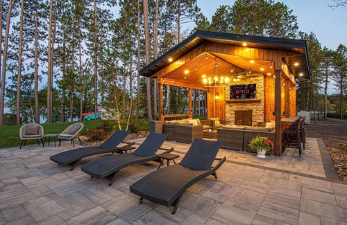 The Island boasts an amazing in-ground, heated pool ($250 nightly charge from Labor Day to Memorial Day) amidst a beautifully landscaped 5,000SF lakeside patio, complete with two hot tubs, an outdoor kitchen, lakeside cabana & fireplace, stone sectional with a fire table and outdoor seating for 80+. Additionally, there is a 35’x65’ concrete sport court area to enjoy pickleball & basketball with dedicated tetherball and volleyball courts as well! Multiple fire pits, docks, paddle boards and kayaks - even a few disc golf baskets!