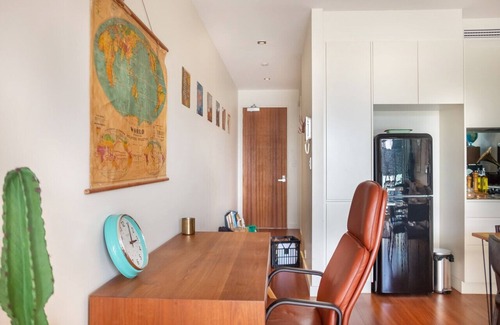 ➞ Work from home at the quality walnut desk and comfy leather chair in this stylish warehouse apartment, located in the best location in Sydney!