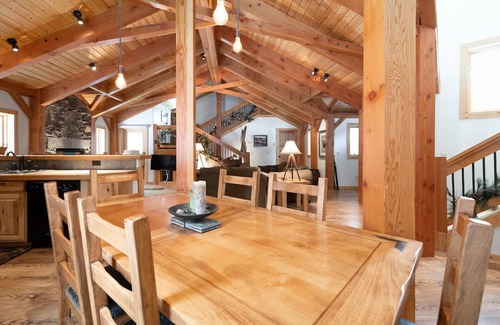 The living area is spacious with vaulted ceilings, exposed timber trusses, and a gorgeous floor-to-ceiling river rock gas fireplace and comfortable couches for relaxing while you enjoy the views through the large windows. There’s also a flat-screen TV for watching a movie or the morning snow report. The attached dining room has a nice dining room table with enough room for six people and there’s room for three more at the kitchen counter.