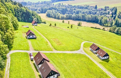 Stárkov 18 km from Náchod: Resort "Stárkov", 450 m a.s.l semi-detached, built in 1997, surrounded by meadows. 22 houses in the resort. On the outskirts, in a sunny, elevated position on a slope, along the wooded area, 24 km from the lake, 10 km from the skiing area, in the countryside. For shared use: property 10 ha, meadow, pond, swimming pool (8 x 4 m, depth 150 cm, seasonal availability: 15.Jun. - 16.Sep.). Table tennis, volleyball, badminton, volleyball court, beach volleyball, patio, barbecue, fireplace, children's playground (slide, swing, sandbox). In the complex: reception, lounge, bistro, massage (extra). Billiard table, table football, trampoline, kiosk, storage room for bicycles, laundry (extra). Linen change (suppl. charge extra). Towel change (suppl. charge extra). Room cleaning on request (extra). Bread roll service possible on request. Pre-arrival grocery service. Motor access to 200 m from the house. Parking at the house. Grocery 1 km, supermarket 8 km, restaurant 1 km, café 10 m, bus stop "Stárkov,mlékárna" 280 m, railway station "Žďár nad Metují" 4.6 km, indoor swimming pool 18 km. Golf course (9 hole) 26 km, sailing school 26 km, tennis 500 m, riding stable, walking paths from the house, cycle lane 10 m, ski lift 6 km, ski school 17 km, cross country ski track 100 m, ice rink 8 km, children's playground 10 m. Nearby attractions: Adršpašsko-teplické skály 15 km, Náchod 17 km, Broumovské stěny 17 km, Ratibořice a Babiččino údolí 22 km, Broumov 24 km, Relaxpark Pec pod Sněžkou 50 km. Well-known ski regions can easily be reached: Radvanice 10 km, Petříkovice 17 km, Mladé Buky 36 km. Well-known lakes can easily be reached: vodní nádrž Rozkoš 26 km. Please note: suitable for families, suitable for seniors baby equipment on request (included). The photograph shows a typical example. All houses/apartments are individually designed/furnished.