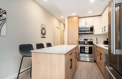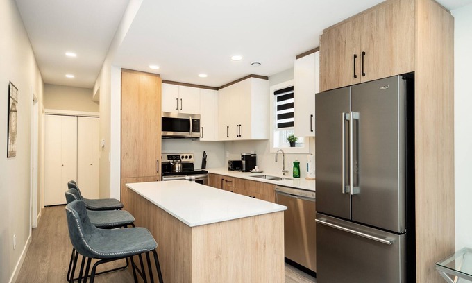 Trendy unit boasting a modern design and neutral finishes. Complete with 2 bedrooms, 1.5 baths, in-suite laundry, wifi, and a smart TV it makes for a restful vacation! The ultramodern kitchen contains high-end stainless steel appliances, Quartz countertops, and all essential cookware. A Keurig is provided with refillable pods and coffee for your daily morning coffee!