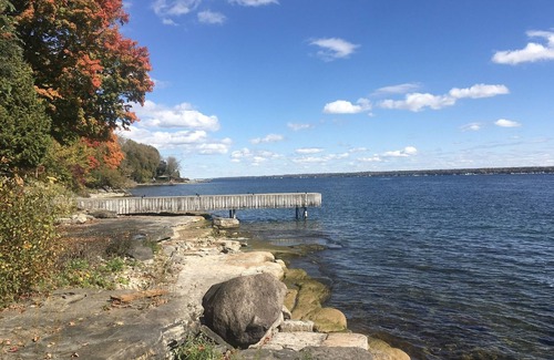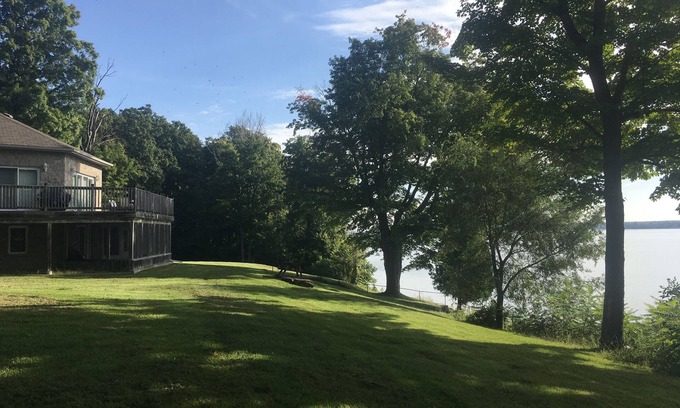 Stone cottage bungalow with private wharf , 400’ waterfront on 4 manicured acres . Large outdoor deck for alfresco dining ,sunrise till sunset exposure.Large Screened room off lower level for evening’s dining.Fully furnished with plenty of outdoor patio furniture . Well equipped kitchen ,dishwasher, microwave ,fridge ,bbq . Laundry facilities ,soap etc.. Turnkey accommodations with the The town of Brockville located within an easy walk ,bike or 2 minute drive . Wonderful view and privacy along Canadian side of St. Lawrence . Golf 3 minutes away , fishing 30 seconds away on your own pier .( pike ,bass , pickerel and Muskie ) Kayak supplied along with water toys ,life jackets and some simple fishing equipment.