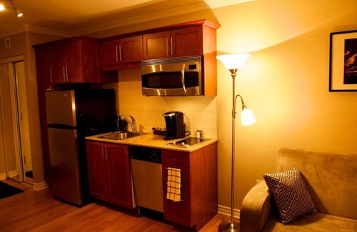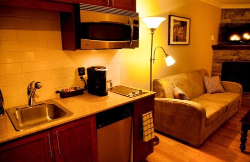 This is a lovely studio located in the charming and prestigious Saint-Sauveur Valley. It's a superior studio with 1 king size bed and 1 sofa bed, fireplace, beautiful bamboo floor, dining area, full kitchen, dishwasher, therapeutic bath, separated shower, and amenities. It's perfect for couples, solo travelers and families (with children). Just a few mins away from ski slopes, walking distance to shopping mall and restaurants, near golf and water slides. Free WiFi and Free Parking.