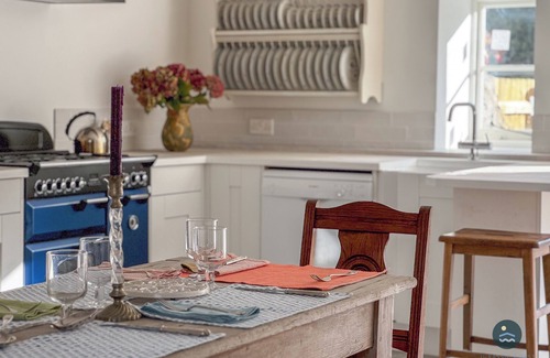 On arrival, you are greeted by the charming cottage exterior, with stone walls and wooden framed windows. Patio doors open in to the cottage style kitchen, complete with rangemaster cooker, dishwasher, Belfast sink with hot tap and freestanding fridge / freezer. The kitchen is open plan with the dining area, with large farmhouse style dining table and seating for eight. The living room is light and airy, with a wood burner and stairs that lead to a mezzanine floor above. The mezzanine has a sofa bed, which can be made up to accommodate 2 guests on request (please request at the time of booking). Also on the ground floor is a family bathroom, with freestanding bath and chequerboard floor. There is also a useful utility and boot room which houses the washing machine. Up to the first floor are three beautifully decorated bedrooms and two more bathrooms; The master king en-suite, a double bedroom and a twin bedroom which share the family shower room across the hallway.