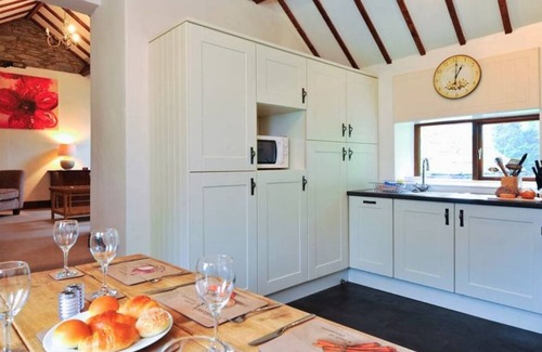 The front door leads into an open plan kitchen/dining area. This lovely fitted kitchen complete with electric oven, hob, dishwasher, fridge/freezer, microwave and washer/dryer is very well-equipped for self-catering.