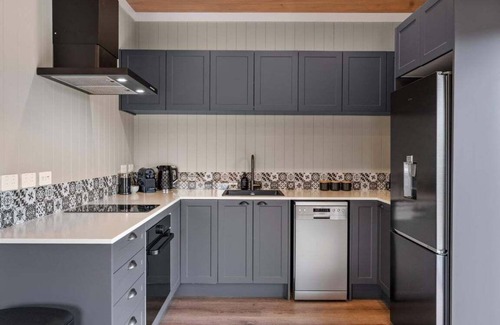 Fully self-contained with a well-equipped kitchen and laundry (washing machine included). Expansive sun-drenched deck with BBQ for outdoor dining.