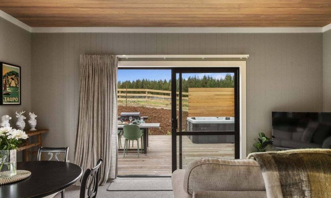 Stagford Barn – Modern comfort in a peaceful rural setting, with your own private hot-tub. Welcome to Stagford Barn, a brand-new two-bedroom retreat just 10 minutes from Taupō town centre and the shores of Lake Taupō. While its name hints at rustic charm, this private unit is fully modern, stylish, and designed with your comfort in mind.