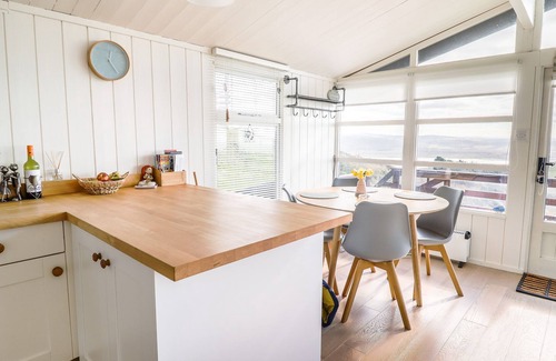 The living areas inside the all-ground-floor lodge include an open-plan living space with a kitchen containing an electric oven and hob, microwave and fridge, a dining area with seating for four people, and a sitting area with a TV and board games. The bedrooms consist of a king-size double and a twin, along with a shower room with a washing machine. Outside, there is a front decking area with furniture, extra chairs and crab fishing equipment, a shared sloped garden, and an on-site car park. Within 1.2 miles, you will find a shop, pub and beach. Please note that this is a pet-free and non-smoking property. Fuel, power, bed linen and towels are all included in the price. Stargazing welcomes a family of four to enjoy the sights of North Wales' superb coast. Note: After parking the car park, there is a sloped path and steps leading up to the lodge and may not be suitable for those with limited mobility.