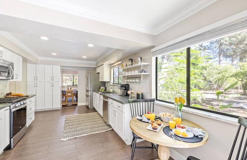 Rejoice in the serenity that exudes from this dreamy Big Bear getaway. Spend your days galivanting around the nearby lake, shred some snow on Big Bear Mountain or take to one of the many hiking trails nearby. The interior of this home is a warm invitation of bright tones and gorgeous modern furnishings. The kitchen is any chef's dream come true and is perfect for whipping up delightful meals that are sure to bring the whole crew together. Spend your evenings cozying up around the fireplace while the musician amongst you gets a singalong going with the aid of the provided guitar.