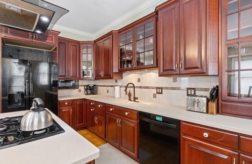 The kitchen has all the amenities for cooking, including a gas range. There are three bedrooms on the second floor, two with king beds and one with two single beds, plus two full bathrooms.