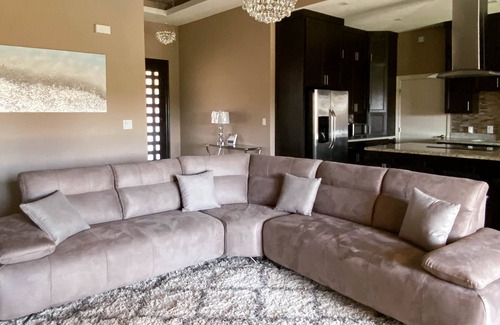 Relax in the open living area, where a large sectional and flat-screen TV create the ideal setting for movie nights.