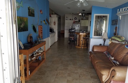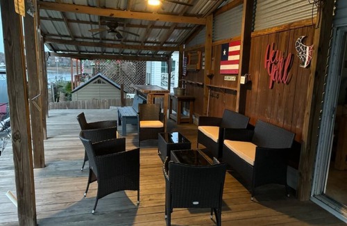 Guests are sure to enjoy a memorable vacation on Lake Conroe in this fully furnished, 4 bedroom /2 bath 2300sft double wide mobile home, with large porch overlooking the water. The main/master bedroom has a king size bed, while the 3 remaining rooms are furnished with 2 queen sized beds and 1 bunk bed for sleeping 10 people. Also has full size washer and dryer for your daily use. The spacious living room is furnished with 46" TV with dish satellite and WiFi . The kitchen is perfect for dining as it is equipped with large home made table . Situated in a cove on Lake Conroe , guests can enjoy an afternoon of swimming or fishing off the large deck in the rear of the house, as the house faces west it is a beautiful place to watch the sunset from the rear deck. An early check-in/check out