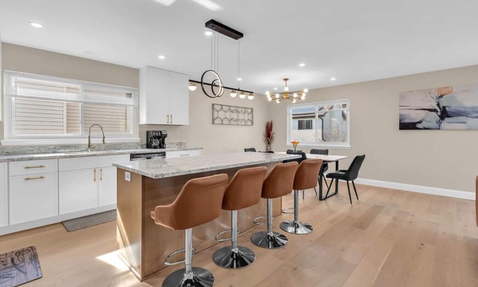 Upstairs, you’ll find a stunning open-concept kitchen fully equipped with everything you need, plus a large dining area and kitchen bar for gathering and sharing meals. The cozy living room features a 60” Roku TV for relaxing nights in.