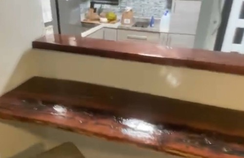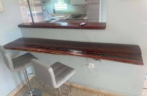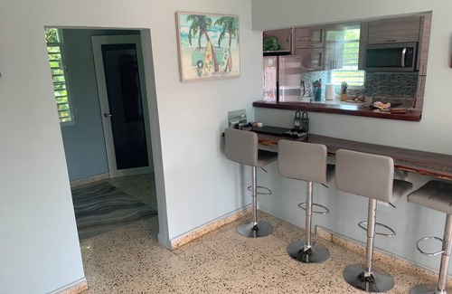Pick fresh bread fruit from trees and cook in your stainless steel kitchen. Designed by surfers for 2-6 adventure seeking ocean loving travelers. Conveniently close to the beach, you can hear the waves, in authentic Playuela, Aguadilla. On a fruit farm full of breadfruit year round and seasonal mango, avocado, banana, tropical almond, monkeypod, jackfruit and more. Cook your own hand picked bread fruit in the modern stainless kitchen with dishwasher, microwave and two burner cook top. The open walled kitchen pass thru allows entertaining fun as your meal is passed onto the unique cedar wood river bar tops - hand built from cedar wood and local sea shells. Just outside the kitchen on the authentic traditional balcony is a propane barbeque grill and beautiful view of the surroundings which include an oil palm forest and authentic architecture-in the distance. There you will find the outside dining area with a large table. The living room has wonderful sunset views through two enormouse picture windows one pointed over the Playuela Preserve boasting a genuine leather couch and large smart TV. The master bedroom has a king size bed and large wall mounted smart tv with windows facing the fruit farm to the north and east. The guest bedroom has a designer bunk bed with full mattress on top and a twin bed below. Each bed has its own window which can be opened to the sound of the waves only 700 meters away. The bathroom shower is wonderful with blue pebble stone tile from floor to the ceiling and two showerheads, one rain water. There is a balcony on the front of the house where dive gear and surfboards can be locked behind the authentically Puerto Rican iron gates facing the Playuela Preserve across the street. The back yard meanders a full half cuerda up the hill with three gardens of fruit trees including mango, avocado and 30+ year round breadfruit trees. There are no neighbors on any side of the property, to the south is a large grass field and traditional houses stretching up a hillside covered in palm tree farms. Directly across the paved road that leads to ample off street parking for up to four cars is the Playuela Preserve where trails lead to many oceanfront destinations including the surf beach of The Mix and the diving beach they call Pena Blanca. Trails lead to Wilderness Beach and the natural preserve to the North. Complete privacy. The only sounds you might here are rustling of the many iguanas in the trees, the thousands of song birds surrounding the preserve, the occasional wild chickens that roam and the two female dogs that live on this hillside and bark at any lost surfers that find their way down to the end of our road. The outdoor conch shell shower with hot and cold water is an amazing place to rinse off the salt water, with a board rack for convenience. The Closest house to Wilderness for surfing. Five minutes from Pena Blanca for diving (two masks and fins included), minutes to Wishing Wells and the Wilderness Trails. Ten minutes from Surfer's Beach, Crash Boat Beach, Downtown Aguadilla and BQN airport. Fifteen minutes to Jobos, 30 minutes to Arecibo River Adventures, 45 minutes to Rincon and Gozalandia Water Falls. Perfect location on the Playuela Preserve. A level of privacy hard to find in all the island. Experience the harvesting of breadfruit and grill as much as you like with your dinner. Paradise found in Playuela, Aguadilla.