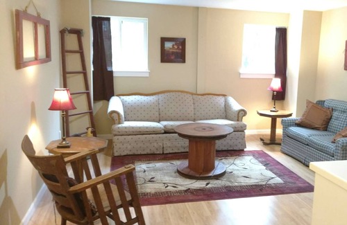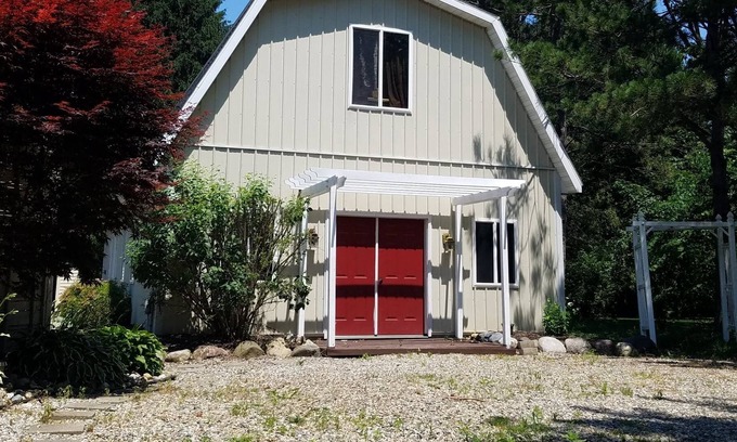 Adorable 1 bedroom apartment/ barn-loft located in a quiet country setting but still just two minutes from I69, 7 mins from airport, 10 mins from major Lansing restaurants and shopping, & 20 mins from MSU. No shared walls. Laminate flooring. Spacious living room with large plasma TV with Roku and guest Hulu account available to use. Wifi. Large kitchenette available with toaster oven, double hot plate, microwave, coffee pot, fridge, pots and pans, and dishes. Cold central a/c. French doors lead to a full bed in the bedroom. Queen pullout bed w/ memory foam mattress in living room. Behind the barn is a fire pit and patio that looks into the pines. You are welcome to use the fire pit. Beautiful landscaping all around. We are right next door. Welcome to our "barn"!