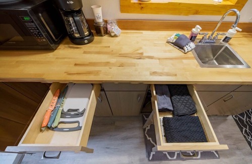 Small kitchenette is set up efficiently to prepare a meal. Kitchen is stocked with basic utensils, dinnerware and small appliances: small refrigerator, hot plate, electric skillet, microwave, and coffee maker make preparation simple. There is a college sized refrigerator as well as a small sink, however there is NO dishwasher, stove or oven. Kitchen is attached to a small seating area with seating to accommodate up to (2) and a table for eating or working remote.