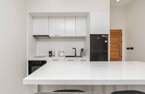 The kitchen is well equipped with appliances such as an induction stove, oven, refrigerator/freezer, toaster, kettle and a Nespresso coffee machine.