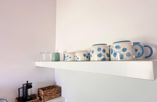 Electric hob, coffee maker, fridge with freezer, electric kettle, microwave, wine glasses, tableware and kitchenware.