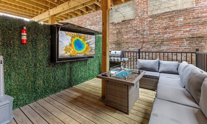 Welcome to your downtown Indy retreat off Mass Ave! Walk to top restaurants, Lucas Oil Stadium, Gainbridge, and the convention center. Enjoy a full kitchen, blazing 1 Gig internet, and a balcony with fire pit, TV, and Grill for relaxing nights. One free parking spot included. NO ELEVATOR - 5 steps.
