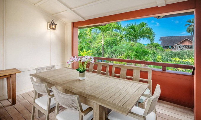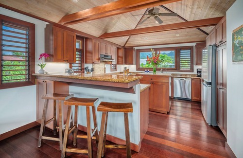 Two primary suites with king beds and air conditioning are located on the first level. You also have a daybed with two twins in case you have little ones. On the second level you have an open design with vaulted ceiling and lots of windows. The kitchen is open to the living room and you even have a pune’e for lounging indoors. Through the glass sliders you will find your covered outdoor dining room. Enjoy the scent of Hawaiian flowers on the breeze as you dine outdoors. There is a single car garage for your use and indoor laundry room.