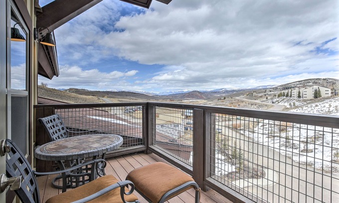 STEP OUTSIDE: Private balcony w/ 2-person dinette, lighting & mountain views