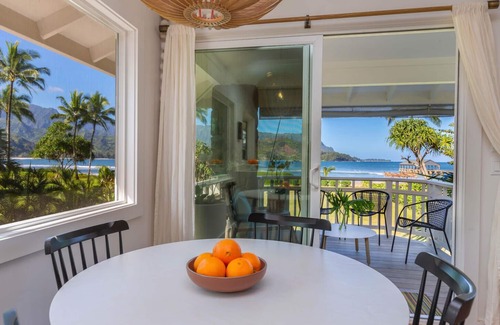 This beautiful beachfront Hanalei Bay home is located steps from the sand on Kauai's majestic North Shore. Enjoy the best views of the pier, surf, mountains, and sunsets over Mt. Makana the north shore has to offer. This modern updated cottage has 2 bedrooms and 1bath. Paddle straight from the front yard to world class surf or enjoy a stroll along the gorgeous Hanalei Bay! Gorgeous outside private shower and all the amenities needed to make your stay unforgettable