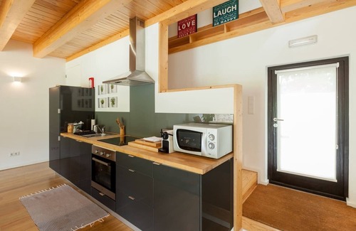 The farmhouse is composed of a bedroom, a bathroom and a sofa bed upstairs and downstairs they have a living room and a kitchenette. The Kitchnet is equipped with ovens, stove, microwave, dishwasher, coffee machine and juice and all the necessary utensils to a kitchen.