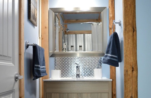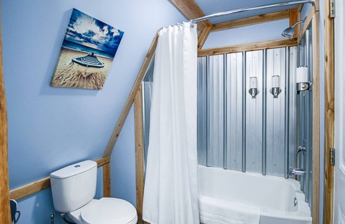 The bathroom is located on the main level. Here you will find a bathtub, shower combination, a sink with vanity space. Shampoo, conditioner, body wash, toilet paper, a blow dryer, hot water bottle, cold compress, towels and night light.