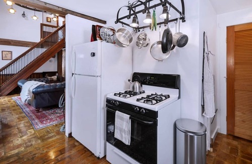 A unique 1887 reconstructed carriage house sleeps 8 in bedrooms with a/c and high quality memory foam mattresses, All-Clad cookware, shuffleboard and games to enjoy around the gas fireplace.