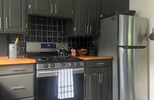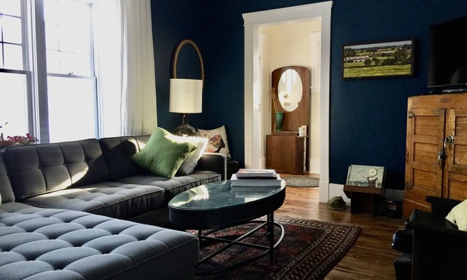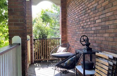 Truly, this is our whole home for you to enjoy. Minimum stay is 28 days. Wrap around porch on the river and walking path to TJ Dolan conservation area. Short walk to downtown restaurants and theatres. Three bedrooms, cosy living room, dining room with a view. All kitchen amenities, and a gas stove. Children and pets are welcome. Although the yard is not fenced, there is a small area for pets that is fully fenced in. Two car parking plus a wild garden. We do have air-conditioning, but it is window units in the bedrooms, and on the main floor. Laundry in basement. Detached garage and storage area in basement are used by owner for business purposes and may need to be accessed on occasion.