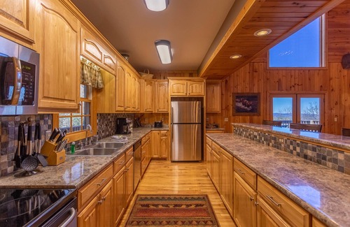 Enter the main level with just a few steps from the parking area. A half bath and a laundry room are off the foyer entrance, and a few steps beyond is the great room. A two-story stone wood-burning fireplace and herringbone woodwork is on one side of the room, with a leather sectional couch in front of it. An HDTV in an entertainment hutch beside the fireplace. Behind the couch is a dining table with six chairs, and there's room for up to four more at the kitchen counter in high-backed stools. The kitchen has a lovely tile backsplash and stainless steel appliances.